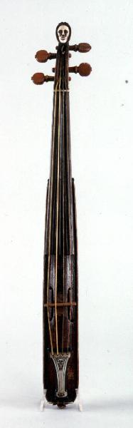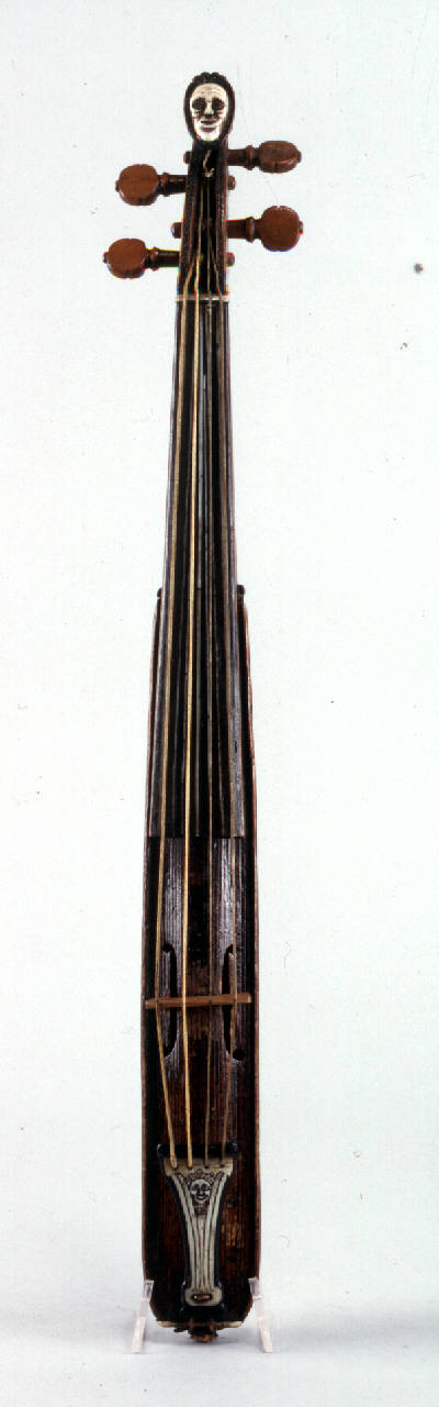 Lo strumento è a forma allungata ed è scavato in un blocco unico di acero. Il corpo ed il manico sono completamente intarsiati con decorazioni in noce ed avorio. I lati della cassetta dei piroli hanno intarsi di avorio inciso. La cassetta dei piroli è decorata con una testa umana in avorio. I fori armonici sono a forma di C allungate voltate verso l'esterno, con due tacche per la posizione del ponticello. La tavola, bombata e con i bordi sporgenti dal corpo, è in un solo pezzo di abete. Il filetto, solo sulla tavola, è molto irregolare, con il bianco in pioppo e il nero di un legno difficilmente riconoscibile, forse noce. Lo strumento monta quattro corde. La tastiera è a cuneo, di tipo barocco, in noce con filettature longitudinali in acero ed avorio. La cordiera è in ebano con un intarsio in avorio inciso. La vernice, pressoché integra, è di colore rosso marrone.
