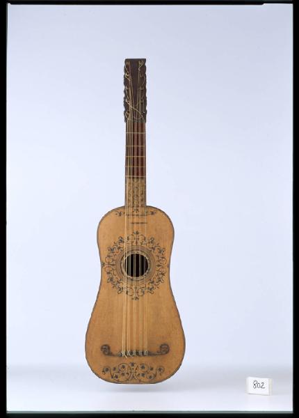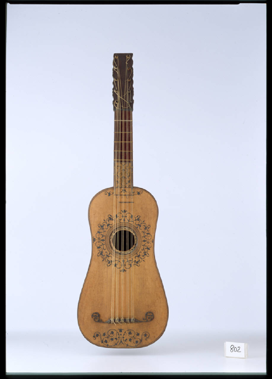 Questa chitarra, di tipo barocco a cinque cori doppi, é opera di qualche ottimo liutaio dell'Italia settentrionale, probabilmente di area veneziana. Lo strumento é in discrete condizioni: conserva tutta la sua vernice originale, rappresa in grumi con un craquelé finissimo ed ha avuto un intervento significativo solo all'attaccatura della paletta al manico, reincollata e modificata. La tavola é in abete a venatura fine con un filetto di acero e palissandro a tre strati attorno al perimetro esterno e attorno alla buca, dove forma tre cerchi concentrici. Il piano é intariato con motivi vegetali a stucco nero attorno alla buca, all'attaccatura del manico e sotto il ponticello. Quest'ultimo, probabilmente non originale, ha due baffi decorativi in ebano, anch'essi non originali. Della rosetta centrale in pergamena rimane solo lo strato superiore e l'anello di raccordo in cartone rosso con il secondo livello. Il piano non é verniciato.La cassa é in legno di tasso.