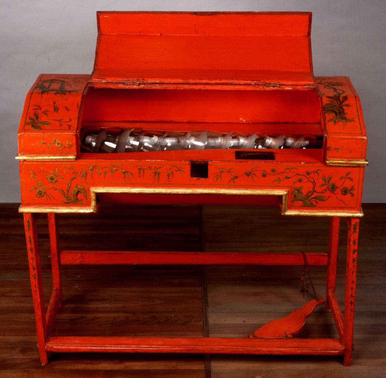 Fu Beniamino Franklin a perfezionare questo tipo di armonica a bicchieri, costituita da un asse centrale rotante sul quale sono fissate una serie di coppe di cristallo; l'asse viene azionato da un pedale mentre una vaschetta sul bordo contiene l'acqua necessaria a inumidire i polpastrelli che sfiorano i bordi dei bicchieri. Per un breve periodo lo strumento ebbe grande successo, poi, a partire dal 1830 venne dimenticato. Fin dall¿antichità, soprattutto in Oriente, si trovano accenni all¿uso del vetro per scopi musicali. La prima allusione a bicchieri musicali in area Occidentale si trova nel Theorica Musicae di Gaffurio, stampato a Milano nel 1492. Verso la metà del XVIII sec. si diffuse la moda di suonare una serie di bicchieri di cristallo intonati di diverse grandezze oppure bicchieri di ugual misura riempiti di acqua a differenti livelli, in modo da ricavarne suoni di diversa altezza. Questi bicchieri potevano essere percossi con bacchette o sfregati sul bordo con i polpastrelli delle dita.