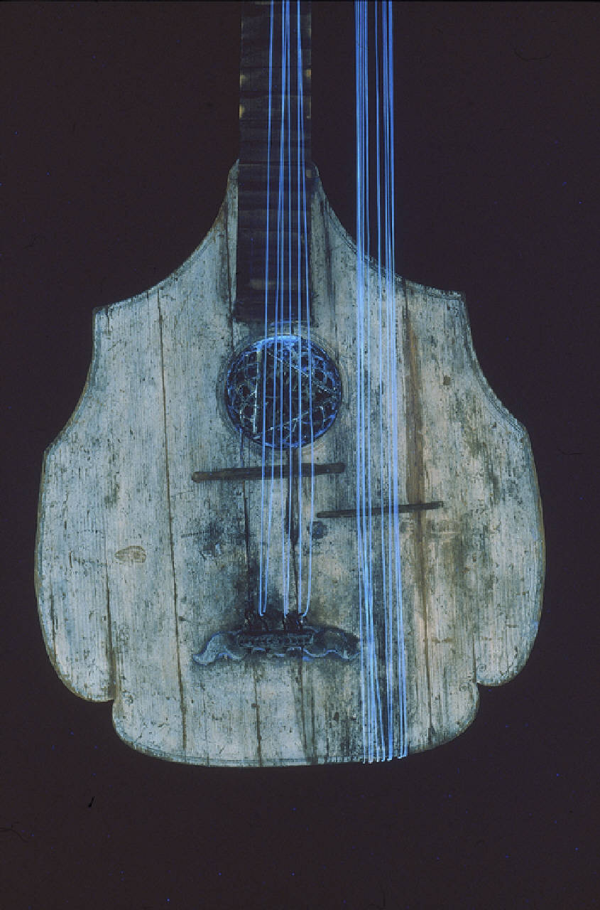 La tavola armonica è in quattro pezzi di abete, uniti specularmente. Le corde tastate sono agganciate ad un particolare di legno, incollato nella zona inferiore della tavola armonica, passano su un ponticello mobile per poi transitare sulla tastiera. Le corde di bordone sono agganciate alla estremità inferiore delle fasce tramite piccoli chiodi, per poi passare su un secondo ponticello, anch'esso mobile. La rosetta, circolare, in materiale cartaceo, ha una sagoma decorativa a forma triangolare ed è disposta su diversi piani. L'intero profilo della tavola armonica e il contorno della rosetta sono decorati con filetti dipinti. Le fasce sono in acero marezzato mentre il fondo, il tacco, il manico e il cavigliere sono anch'essi in acero, ma non marezzato. Il retro del manico, come di consueto, è spesso dalla parte del cantino e sottile dalla parte opposta. La tastiera, in legno tinto di scuro, è divisa in diciotto tasti e l'attaccatura tra il manico e la cassa armonica è posta tra il nono e il decimo tasto. Il capotasto è in metallo. Il doppio cavigliere a forma di "S" termina a falcetto, con una sorta di scudetto all'estremità. Il secondo capotasto è in avorio-osso e i piroli, tinti di scuro, hanno decorazioni in avorio-osso (alcuni non sono originali e non hanno le decorazioni).