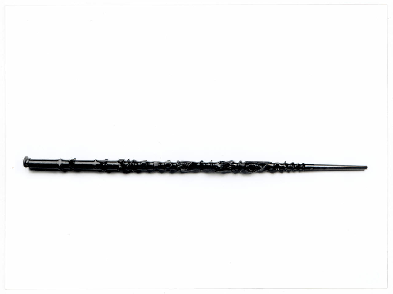 Strumento verniciato e scolpito ad imitazione di un bastone di ginepro con le chiavi che imitano delle foglie. Chiavi di legno (Mib e Sol#).