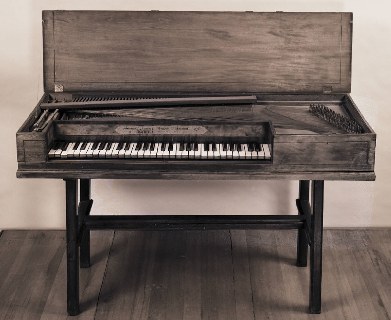 Cassa e sostegno\n\nLo strumento ha sagoma rettangolare con tastiera integrata.\nI fianchi, incollati contro i bordi del fondo, sono lastronati in mogano con filetti di bosso ed ebano. \nIl sostegno di mogano, in stile Chippendale, ha quattro gambe a sezione rettangolare unite da traverse. Gambe e traverse hanno spigoli modanati\nSopra la tastiera vi è una tavola frontale asportabile, lastronata in radica con bordura di mogano. In un inserto centrale di legno chiaro (acero ?) è apposta la firma. \nIl fondo è d'abete, rinforzato esternamente da una grossa traversa centrale dello stesso legno.\nLo strumento è fornito di coperchio con due ribaltine affiancate e di un portello per la tastiera, incernierati insieme; tutti di mogano. Il coperchio è fissato alla cassa.\n\nTavola armonica e somiere \n\nLa tavola armonica d'abete e il somiere si trovano in posizione laterale destra.. \nIl ponticello di faggio, sulla tavola armonica, è in un unico pezzo.\nLe caviglie di ferro hanno testa oblunga.
