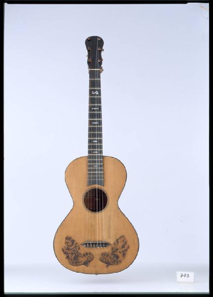 Chitarra dell'inizio del secolo XIX con forma ad "8" non molto arrotondata, specie superiormente e con fasce alte. Risente ancora di qualche influenza settecentesca nella forma. All'interno un'etichetta a stampa:"ANTONIO MONZINO/fabbricatore d'istrumenti e corde armoniche/in Milano nella contrada della Dogana N.4037./tiene pure corde armoniche per fabbricatori/di capelli, e per batter lana e cotone, non/ché un assortimento de' migliori violini di/classsici autori, specialmente cremonesi. Vende/inoltre musica stampata di proprio fondo/ fece anno 1820", quest'ultima dicitura con la data è a penna.Piano in abete non verniciato a venatura fine e finissima in due parti speculari, contornato da un filetto esterno di ebano e da un filetto a otto strati di ebano e acero attorno alla buca rotonda centrale. Sotto il ponte, non originale, rimane buona parte della decorazione floreale in lastra di abete tinta di nero. Fasce e fondo sono in ciliegio, il fondo è un pezzo unico, vistosamente crepato.