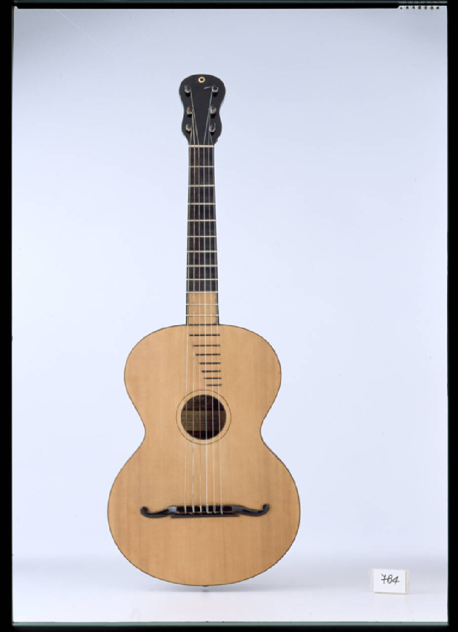 Bella chitarra, in buono stato di conservazione, costruita da Carlo Guadagnini, uno dei più abili costruttori di chitarre di questa famiglia. La forma è quella classica, messa a punto dai Guadagnini, a forma di otto allargato con le fasce piuttosto basse. All'interno sono posizionate due etichette; la prima riporta la dicitura a stampa: "Carlo Guadagnini fece in Torino nell'anno 180(6)? Dirimpetto a Facaldo". L'anno è manoscritto. La seconda, a stampa: "Riparato e corretto da Antonio Monzino - Milano, via Rastelli, 10". La tavola è in abete a venatura media non omogenea e non è verniciata, probabilmente è stata carteggiata nel laboratorio Monzino; è cinta da un filetto a quattro strati sottili di noce mentre attorno alla buca c'è un semplice doppio filetto in noce con un altro cerchio leggermente più esterno rispetto al primo. Sulla parte destra della tavola, dalla parte degli acuti, una galleria di tarlo è stata stuccata.