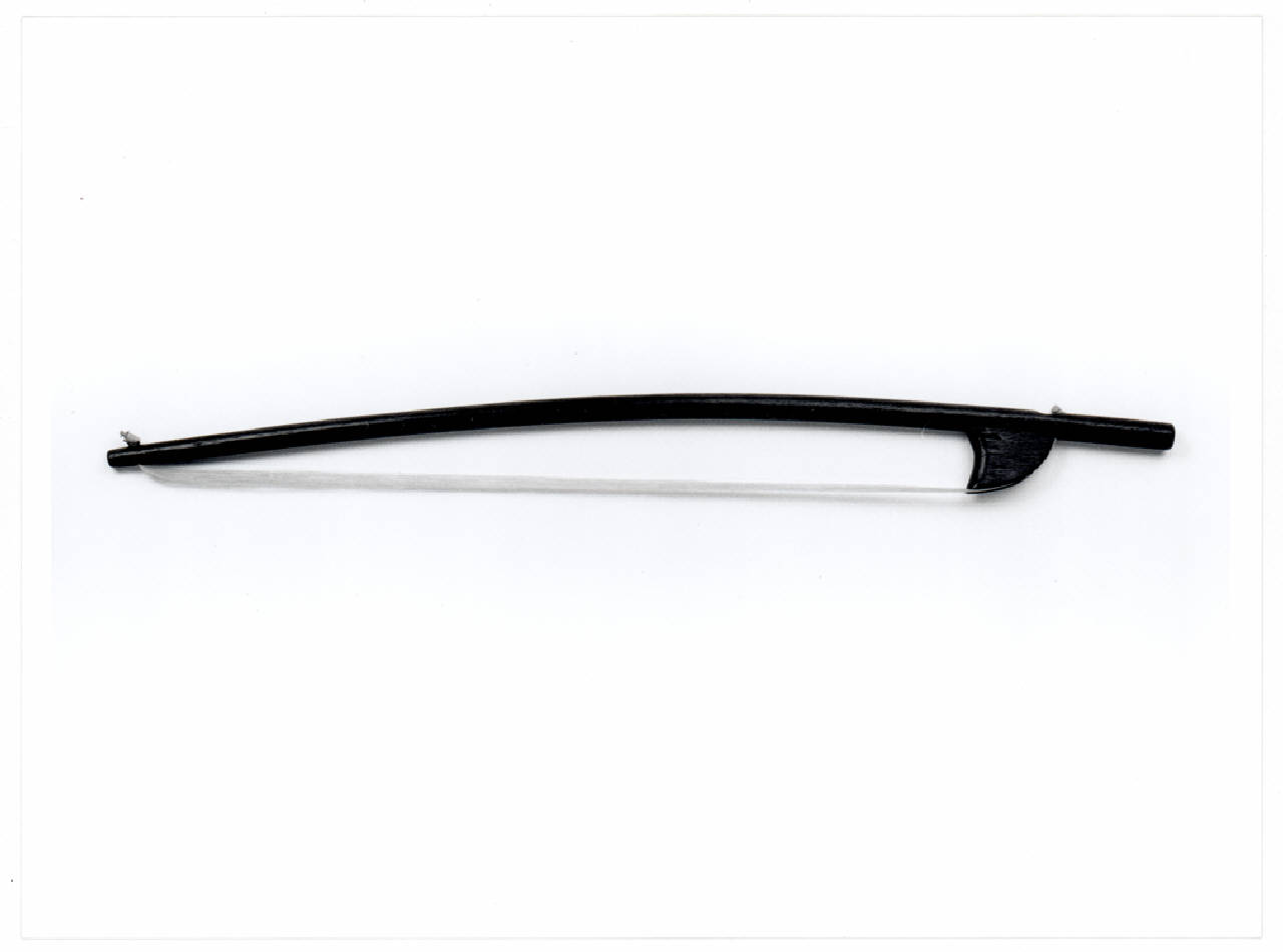 É un arco ad alzo fisso, cioè il nasetto serve solamente a tenere i crini distanti dalla bacchetta. Questa, a sezione rotonda, è in palissandro, curvata verso l'esterno e senza alcuna testa. Alle estremità, i crini passano attraverso due fori praticati nella bacchetta e fermati dall'altro lato con nodi. Il nasetto, in palissandro, è fissato alla bacchetta tramite due perni di legno. Non vi è alcun timbro.