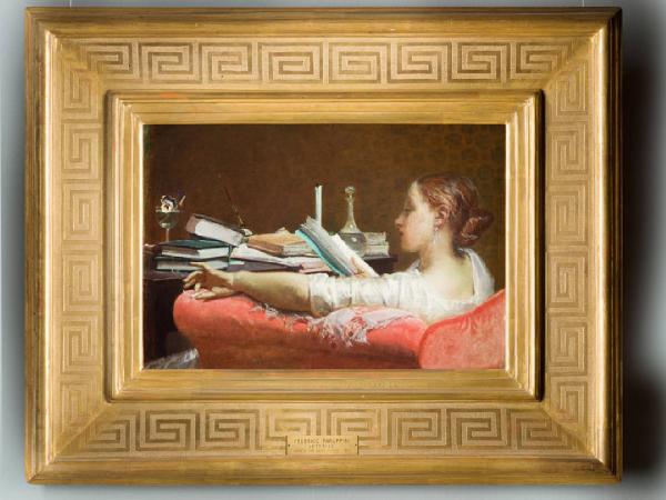 Lettrice. giovane donna, seduta in una poltrona rossa e attorniata da llibri sparsi su un tavolo, legge un libro