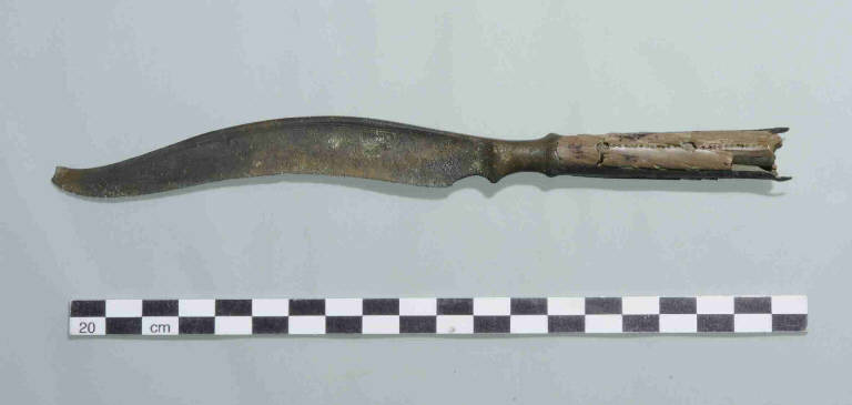 - NOTIZIE STORICO CRITICHE Il coltello, inteso come strumento per tagliare con un solo lato affilato, è un'innovazione introdotta in Italia a partire dal 1300 a.C. circa; prima infatti esistevano solo pugnali, dotati di filo su entrambi i lati. In termini di tipologia archeologica, l'esemplare in esame si colloca fra il tipo "Matrei varietà B", per la presenza del nodo di raccordo inferiormente sporgente, e il tipo "Vadena varietà A", per la forma della lama e per la lingua da presa preceduta da un nodo.\nRinvenuto nel sito archeologico palafitticolo del Lavagnone (Desenzano d/G) il manufatto è da considerare di particolare pregio, come dimostrano l'accuratezza dei dettagli, l'utilizzo di materiali preziosi, simbolo di prestigio dell'antico proprietario, e il fatto che originariamente la lama del coltello, in bronzo, doveva presentare una lucentezza quasi dorata. La decorazione sulla lama costituisce un ulteriore testimonianza della raffinatezza e del significato simbolico dell'oggetto: gli uccelli acquatici sono infatti spesso raffigurati mentre trainano la barca solare, simbolo della ciclicità della vita, secondo una concezione diffusa in Italia e nell'Europa centrale, almeno fino ai primi secoli dell'età del Ferro (IX-VII secolo a.C.).