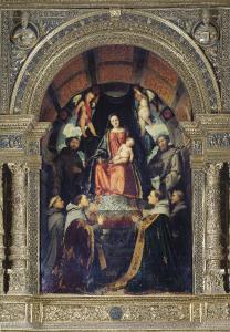 - NOTIZIE STORICO CRITICHE Il dipinto rientra a pieno titolo nel clima di rinnovamento generale della chiesa e dell'annesso convento promosso, nell'ultimo quarto del XV secolo, da padre Francesco Sanson. Bresciano di origine, il Sanson, il cui vero cognome era Nani, divenne generale dell'ordine francescano nel 1475 e si adoperò per arricchire di opere d'arte di primaria importanza il convento della sua città natale. Fra esse c'era la pala dell'altare maggiore che commissionò, in prima battuta, a Leonardo da Vinci, il cui interesse per il dipinto non andò oltre uno schizzo sommario del programma iconografico. Morto il committente, i suoi esecutori testamentari affidarono l'esecuzione della tavola a Girolamo Romanino che, rispetto al progetto originale, crea una composizione meno affollata di santi. Leonardo, probabilmente per precisa volontà del Sanson, aveva previsto le figure dei SS. Faustino, Giovita, Pietro, Paolo, Elisabetta d'Ungheria, Chiara, Bernardino, Ludovico, Bonaventura, Antonio di Padova e Francesco; il pittore bresciano invece esclude i santi patroni della città e le sante francescane, aggiungendo un ritratto del committente riconoscibile nel frate con il saio inginocchiato ai piedi di Francesco d'Assisi. Considerata una fra le opere più importanti del Rinascimento lombardo, la tavola è stata datata fra il 1516 e il 1517 dopo un intenso dibattito critico. Determinate per fissare questo dato cronologico è il confronto con la Pala Martinego di Lorenzo Lotto inaugurata nel 1516. La conoscenza di quest'opera permette a Romanino di aprire la sua formazione legata a Bellini e Giorgione verso suggestioni più strettamente lombarde nella resa dei volti e nell'umanizzazione dei personaggi della storia sacra, nei chiaroscuri più intesi e variati, nell'intensità materica con la quale vengono resi i tessuti. Il dipinto era protetto da due ante che raffiguravano le Storie di S. Francesco firmate dallo stesso artista. Dettagliatamente descritte dalla letteratura artistica antica, sono andate disperse nell'ultimo decennio del Settecento quando il convento fu soppresso e la chiesa adibita a vari usi.