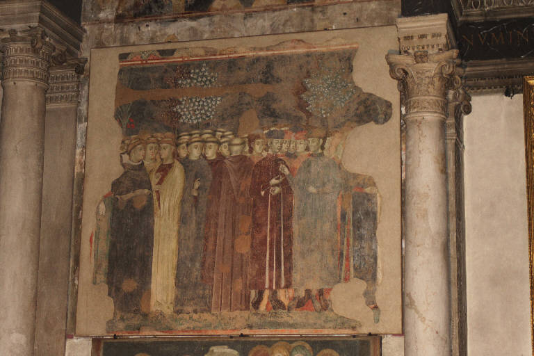 - NOTIZIE STORICO CRITICHE Riportati alla luce durante i restauri che hanno interessato l'edificio negli anni trenta del Novecento, i dipinti murali hanno attirato immediatamente l'attenzione della critica sia per la qualità esecutiva sia perché sono fra le poche testimonianze organiche e di una certa estensione della cultura pittorica bresciana del XIV secolo. Salvo qualche rara eccezione, la letteratura critica ha sempre considerato i diversi frammenti come opere slegate l'una dall'altra ed ha concentrato l'attenzione solo sulla Teoria con angeli e santi, della quale è stato messo in evidenza il legame ancora persistente con la ieraticità e il carattere prettamente disegnativo della pittura bizantina, e sulla scena dei frati e dei laici della quale, invece, si è sottolineata sottolineava l'apertura verso le novità giottesche ed una eleganza già gotica. Questo lacerto, in particolare, è noto a livello critico come la Scuola dei frati e degli studenti perché secondo alcuni troverebbe un riferimento iconografico non tanto nella letteratura sacra, quanto nella storia del monastero francescano bresciano, nel quale, secondo uno storico rinascimentale, sarebbe esistito un vero e proprio istituto di studi superiori di cui questo affresco sarebbe una rappresentazione. I pareri discordanti circa la lettura iconografica e i caratteri stilistici che hanno caratterizzato la storiografia precedente trovano una sintesi organica accentando la lettura unitaria dei lacerti e la loro identificazione come parti di una vasta scena raffigurante il Giudizio Universale, organizzata non tanto in registri sovrapposti, come era d'uso nella pittura contemporanea, ma in grandi riquadri che si sviluppavano orizzontalmente a coprire quasi interamente la parete occidentale della chiesa. Stilisticamente, gli affreschi si collocano in quel filone della pittura lombarda che unisce elementi arcaici di derivazione bizantina come i lineamenti fortemente marcati dal disegno, i nasi a forcella, gli intensi chiaroscuri dei volti, ad aperture verso le novità spaziali e il gusto per la narrazione di carattere giottesco, ed un interesse tutto cortese per la raffigurazione di dettagli della vita contemporanea ed in particolare per la raffigurazione mimetica delle vesti e delle acconciature. Ed è proprio la precisione con la quale viene ritratto l'abito di uno dei laici in primo piano che permette di collocare l'esecuzione dei dipinti entro il 1320, in un periodo nel quale viene meno l'uso della sopraveste con le maniche più corte della tunica e degli abiti accollati e caratterizzati da fitte abbottonature ai polsi. Particolari che sono invece ben evidenti nel'abito rosso e bianco dell'uomo in primo piano.