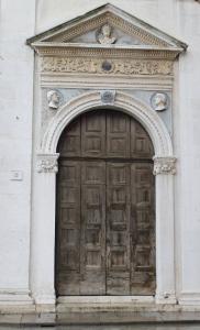 Affiancato da due paraste corinzie di ordine gigante che riecheggiano le arcate della Loggia, il portale presenta una struttura architettonica ed un decoro scultoreo che si ispirano al classicismo e alla cultura antiquaria, ma lo interpretano in maniera eccentrica e originale dando vita ad un manufatto che sembra nascere dal reimpiego fantasioso di materiali scultorei originali. I pilastri in marmo che ne costituiscono gli stipiti non rispettano un ordine architettonico, ma si arricchiscono nei plinti di sculture raffiguranti delfini che si affrontano con i denti digrignati; i capitelli non sono dorici, ionici o corinzi e nemmeno compositi, ma accolgono a sinistra delle aquile su festoni, a destra dei Pegasi rampanti e sono accompagnati da mascheroni a rilievo negli angoli. Nel coronamento superiore tornano i clipei con profili dei Cesari inseriti nei pennacchi dell'arco a tutto sesto e al centro del frontone si trova un busto frontale la cui fisionomia sembrerebbe ricordare non un imperatore romano, ma un personaggio della storia o del governo veneziano. Il fregio è decorato da motivi a candelabra.