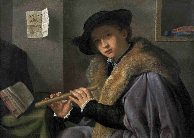 - NOTIZIE STORICO CRITICHE La tela compare per la prima volta nella collezione del cardinale Richelieu nella prima metà del XVII secolo. Come documentato nell'inventario, alla morte del prelato l'opera è assegnata alla nipote e probabilmente ben presto venduta, come la maggior parte delle opere d'arte da lei ereditate.\nIl dipinto ricompare solo nel 1894 in occasione della mostra degli Old Masters provenienti dalle collezioni private britanniche, allestita presso la Royal Academy di Londra, con la corretta attribuzione a Savoldo e non a Giorgione, come riportava invece l'etichetta fino ad allora apposta sulla cornice. Il quadro apparteneva allora a lord William Archer, terzo Earl of Amherst (1836-1910) al quale perviene attraverso la collezione di famiglia probabilmente avviata dal diplomatico William Pitt Amherst, primo Earl of Arracan (1773-1857) e arricchita dal figlio di questi, William Pitt jr (18028-1886). Prima di approdare presso la Pinacoteca Tosio Martinengo come deposito della Banca Popolare di Brescia e poi di Unicredit Group, la tela ha avuto diversi passaggi di proprietà.\nFin dalla sua comparsa all'esposizione londinese del 1894, il Flautista si impone gradualmente come uno dei capolavori del pittore bresciano Giovanni Girolamo Savoldo, distinguendosi per la funzione dominante, coordinatrice e compositiva assunta dal luminismo savoldesco: le implicazioni precaraveggesche e la concezione straordinariamente moderna sembrano infatti preludere al Suonatore di liuto di Caravaggio.\nEvidenti sono anche i rapporti con la ritrattistica di Lotto, soprattutto in virtù dell'ineffabilità psicologica affiorante nello sguardo del protagonista, sottilmente ambiguo tra la tacita intesa con l'osservatore e il distacco di una solitaria meditazione. La consonanza con i ritratti lotteschi, anche di formato orizzontale, eseguiti in coincidenza con il rientro del pittore a Venezia nel 1525, appare probante per la datazione del Flautista. L'esecuzione della tela risalirebbe quindi al secondo soggiorno a Venezia di Savoldo, iniziato attorno al 1521.\nSecondo la critica più recente, le annotazioni leggibili sui due spartiti si rapporterebbero all'esecuzione, secondo una pratica allora diffusa, di un brano in origine destinato al canto a più voci. La firma del pittore, apposta tra i righi dello spartito fissato alla parete, indicherebbe come il musico assente, atteso quale più anziano maestro e amico, sia da identificare con Savoldo stesso. Il Flautista si rapporta del resto alla moda del ritratto allegorico di tema musicale, diffusasi in Veneto tra il secondo e il terzo decennio del Cinquecento, in consonanza con la letteratura del tempo, esemplata al meglio dai notissimi Asolani di Pietro Bembo, dove la musica e la poesia concorrono all' "amoroso pensiero".