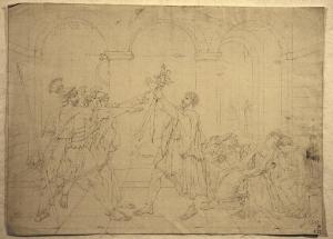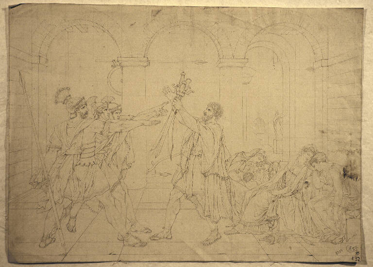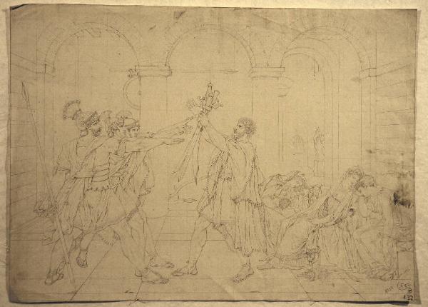 - NOTIZIE STORICO CRITICHE La quadrettatura e la resa attenta di tutti i particolari indicano che si tratta di una copia del quadro eseguito da David su commissione del re di Francia nel 1784 a Roma, dove fu esposto tra il luglio 1875, quando il dipinto fu terminato, e la fine di agosto dello stesso anno (quando fu spedito a Parigi) riscuotendo un grande successo negli ambienti artistici. Si può plausibilmente ipotizzare che il disegno della collezione Lampugnani sia una copia del dipinto stesso o di una copia fedele di questo, eseguita nel primo quarto dell'ottocento, dallo stesso artista autore del disegno n. inv. 4924. La quadrettatura, il formato analogo del foglio e il tratto secco del disegno fanno pensare che anche questo disegno, come quello con inv. 4924, evidentemente dello stesso autore, sia stato eseguito per una stampa.