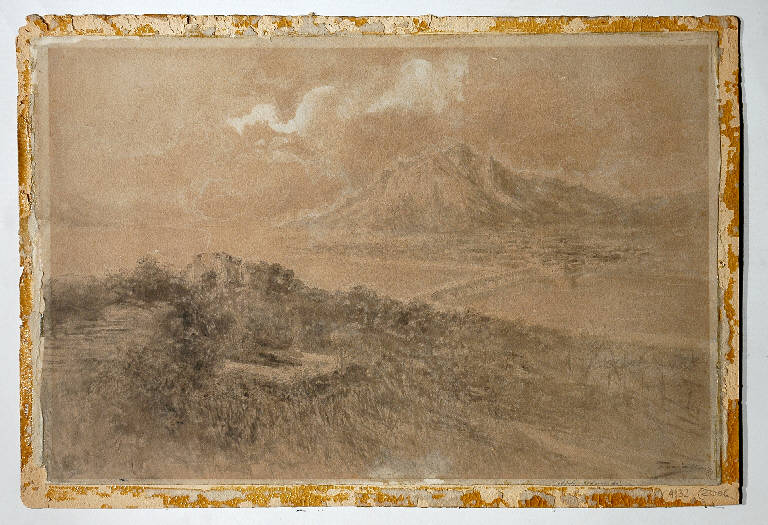 - NOTIZIE STORICO CRITICHE Sul retro del cartone di supporto si trova la scritta a matita "Previati. Ponte di Lecco con S. Martino (Aldo Colombi ??)".\nDue foto a colori del disegno sono conservate nell'album "D6 bis 1800-1900", una di queste riprende solo il dettaglio della firma.\nSi tratta del disegno preparatorio per l'illustrazione del primo capitolo dei "Promessi sposi" editi da Hoepli nel 1900 (p. 6). Il formato è quello tipico delle altre illustrazioni eseguite per il volume, conservate presso le Civiche Raccolte di Milano. Il disegno non appare tra quelli riprodotti in "Archivi del divisionismo" (1968), corrispondenti ai fogli realizzati da Previati per la stessa edizione e consegnati all'editore, ma non utilizzati da questi.\nLa datazione proposta fa riferimento all'anno di inizio della collaborazione di Previati con l'editore Rechiedei per un progetto di edizione del romanzo poi non realizzato, e il 1897, quando, nell'ottobre, l'artista consegna a Hoepli l'ultimo disegno (Daccò 1993) per il volume. Questo ambito cronologico può plausibilmente essere ristretto agli anni 1895-1897, se si considera che nell'estate 1895 Previati, impegnato nella preparazione del corpus di disegni da presentare al concorso bandito da Hoepli, aveva deciso di approfondire la resa della verosimiglianza storica e topografica dei luoghi descritti nel romanzo e trascorse un periodo nei luoghi manzoniani (Dallai 1993).