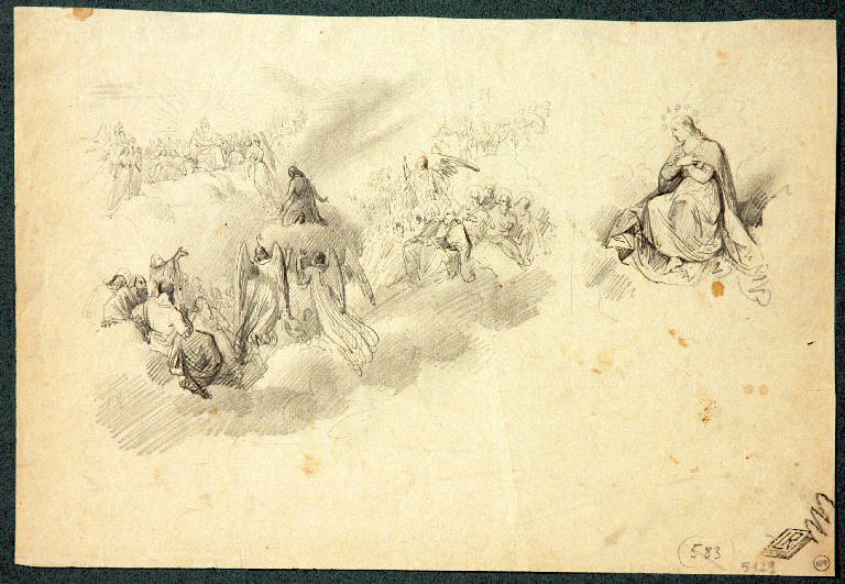 - NOTIZIE STORICO CRITICHE La data e l'attribuzione proposte tengono conto dell'iscrizione, un po' sbiadita, sul verso del foglio,iscrizione che si ritiene antica e attendibile.\nIl soggetto sembra l'ascensione in cielo di un santo, presentato da un angelo a Gesù, sopra a due schiere, di santi e di profeti. Le dimensioni del foglio e il carattere di schizzo fanno pensare a uno studio per uno dei numerosi affreschi di soggetto religioso eseguiti da Paolo E. Morgari per alcune chiese piemontesi intorno al 1870.\nNell'album di foto di Riccardo Lampugnani "D6 1800-1900" è conservata una foto in bn del presente disegno.