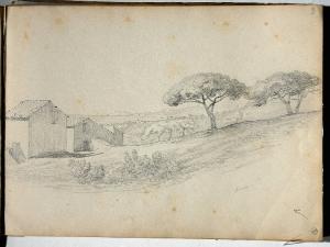 - NOTIZIE STORICO CRITICHE Il taccuino è composto da 52 carte due delle quali (le pp. 51 e 52) non facevano parte originariamente del taccuino per dimensioni, tipo di carta e data. Queste due carte sono state schedate come disegni separati, collegati alla scheda del taccuino tramite riferimento orizzontale. Quattro carte (le pp. 45, 47, 48, 50) sono staccate dal taccuino. Tutte le carte recano un disegno sul recto, tranne la p. 15, interamente bianca, e la p. 44, la quale reca un disegno solo sul verso. Le pp. 12 e 18 recano un disegno anche sul verso e sono state schedate ognuna su due schede distinte per recto e verso, collegate fra loro da riferimento verticale; anche la p. 48 reca un disegno sul verso, disegno che si prolunga sull'intero recto della p. 49: il soggetto (allegoria) delle pp. 48 verso e 49 recto è stato schedato su un'unica scheda, relativa alla p. 49 (INVN 5236.49), collegata alla scheda della p. 48 recto da riferimento orizzontale.\nLe pp. 31, 33, 38, 40, 41, 47 recano ognuna due disegni distinti realizzati sulle due metà del foglio, ricavate con una riga tracciata a matita dall'artista, secondo un'abitudine ricorrente nei taccuini di viaggio di Bossoli (Peyrot 1974). Per ognuno di questi disegni è stata redatta una scheda, collegata alla scheda gemella da riferimento verticale.\nTutti i disegni sono a matita; la p. 28 reca tracce di acquerello marrone; la p. 50 reca l'iscrizione a inchiostro nero.\nIl taccuino non compare tra i 14 taccuini di viaggio citati da Ada Peyrot, e non corrisponde per data e contenuto a quelli citati dalla stessa ma non recuperati e quindi non riprodotti nella sua monografia. Per le dimensioni si discosta dagli altri taccuini di viaggio, che sono più piccoli, se si esclude il taccuino del 1956-1957, di formato analogo anche se un po' più grande (cm 26x36), realizzato in parte a Torino, in parte durante i viaggi a Parigi, Londra e Balmoral. Rispetto a questi taccuini, è più antico e permette di notare l'evolversi del modo di disegnare di Carlo Bossoli, da una maniera più vicina alla veduta ottica descrittiva e particolareggiata, legata alla sua formazione di vedutista e di creatore di cosmorami, per la quale divenne famoso in Italia fin dal 1844, poco dopo il suo arrivo da Odessa, a un modo più abbreviato e pittorico, spontaneo e diretto, evidente nei disegni (non nei dipinti) realizzati dalla fine degli anni cinquanta in poi. La datazione di numerose pagine del taccuino e la frequente iscrizione autografa recante l'indicazione precisa del luogo raffigurato permettono di aggiungere qualche tassello alla biografia del pittore. Il periodo infatti va dal novembre 1847, data del primo disegno (p. 1) eseguito sull'isola di Porquerolles, nella Francia meridionale, a un giorno del 1848 non precisato ma successivo al 15 agosto, quando Bossoli è ancora, verosimilmente, in Francia (p. 50). Dal confronto tra i dati biografici riportati da Peyrot per l'anno 1848 e i disegni datati del taccuino, emerge che il viaggio in terra francese è stato interrotto due volte dal pittore, per il ritorno a Milano nel periodo delle 5 giornate e tra fine luglio e inizio agosto, probabilmente per rivedere la madre malata. I dipinti (un olio e quattro tempere) documentati da Peyrot datati 1848 e raffiguranti alcuni episodi delle 5 giornate (18-22 marzo) furono certamente eseguiti sul posto dal pittore, per il loro carattere di presa diretta e per la non convenzionalità delle ambientazioni, ricche di particolari. Sembra confermarlo, nel taccuino, la prima interruzione, fra il 2 marzo 1848 (p. 14), quando l'artista ritrae una strada in campagna in una località indicata ma di difficile decifrazione, e, dopo la pag. 15, non a caso lasciata interamente bianca, il 22 aprile 1848 (p. 17), quando, dopo aver raffigurato la veduta di un paese mediterraneo, plausibilmente nella Francia meridionale (p. 16), ritrae un paese analogo, che come dice l'iscrizione in basso è Hyères, sulla costa davanti alle isole Porquerolles. Le pagine successive documentano un percorso che risale verso l'Ile de France, avente come meta alcuni paesi e castelli lungo la Loira (Villandry, Amboise). Prima di arrivare a queste mete, dopo il 25 luglio 1848 (p. 23), il pittore dovette tornare una seconda volta a Milano, se è vero come parrebbe plausibile che il 5 agosto vede e poi ritrae Carlo Alberto affacciato sul balcone di Palazzo Greppi in via Manzoni mentre, dopo l'annuncio della resa a Radetzsky, subisce la reazione polemica e incredula dei milanesi (Peyrot, v.I n. 135). In seguito, il 15 agosto, Bossoli è di nuovo in Francia, a Villandry, come si legge a p. 28 del taccuino. L'ultima data scritta sul taccuino è il 3 settembre 1848 (p. 40), accanto al disegno "La Pile 5 Mars. Mo[nument] Romain sur les bords de la Loire". Solo l'ultimo disegno, a p. 50, documenta nel taccuino un episodio del tormentato 1848, non in presa diretta ma attraverso la copia del disegno di un ignoto artista francese raffigurante un momento dei disordini sociali a Parigi.