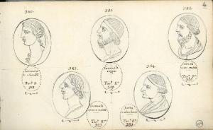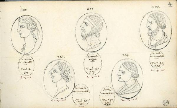 - NOTIZIE STORICO CRITICHE I disegni si riferiscono a gemme riferibili al cinquecento o al seicento, per il loro materiale (la corniola è diffusissima nella produzione di gemme intagliate nei due secoli) e per quanto si può dedurre, dal disegno, dello stile delle teste intagliate.