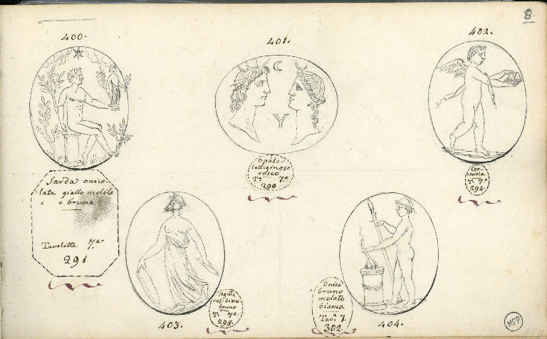 - NOTIZIE STORICO CRITICHE Il disegno della gemma catalogata da Sozzi con il n. 403 raffigura un personaggio non indentificabile: non è chiaro se la testa sia stata lasciata incompiuta o se sia una testa di animale; non sono identificabili gli oggetti che la figura reca nelle mani.