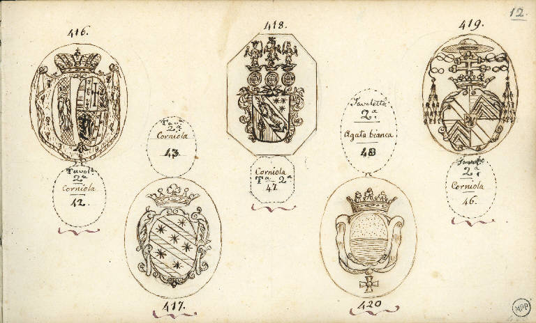 - NOTIZIE STORICO CRITICHE Il disegno con n. 421 raffigura uno stemma gentilizio simile allo stemma della famiglia Vimercati Sozzi, presentato el 1819 dal conte Paolo per il riconoscimento di nobiltà (Caldarini Mazzucchelli 2004, fig. 1), per l'aquila nella parte superiore (aquila bifronte incoronata nello stemma Sozzi) e per la porta tra due torri in quella inferiore (presente anche nello stemma Sozzi, ma senza l'animale alla sommità della porta, dove invece è visibile una grande pigna, mentre sulle due torri sono raffigurate le sagome uguali e in controparte di due uccelli). L'aquila bifronte si ritrova anche in altri due stemmi disegnati in questa pagina, molto probabilmente relativi a famiglie imparentate con quella del conte.