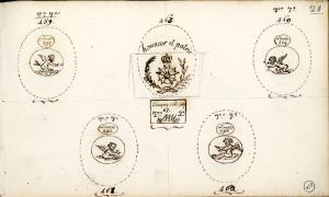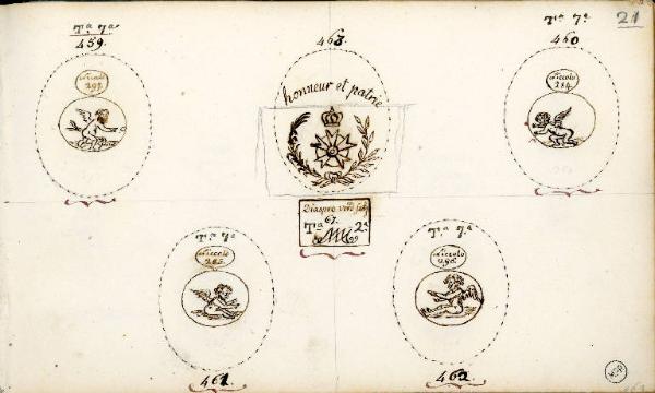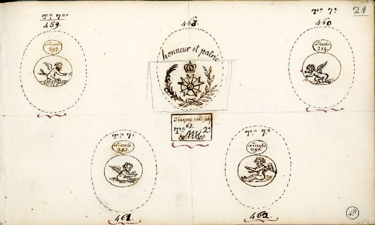 - NOTIZIE STORICO CRITICHE I quattro disegni di pietre in niccolo con amorini fanno parte della stessa produzione e risultano essere, a coppie, pendant una dell'altra (il n. 459 con il n. 460; il n. 461 con il n. 462). Il tipo di materiale e anche il soggetto di queste quattro gemme piccole permettono di ipotizzare che si tratti di gemme antiche.