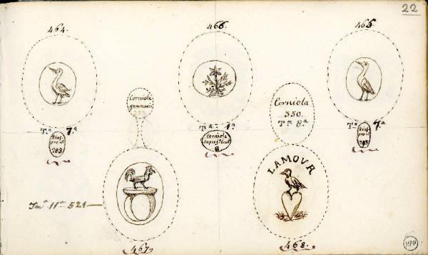 - NOTIZIE STORICO CRITICHE Il disegno della corniola con il cuore e l'iscrizione rimanda al repertorio di Jacques Guay (1711-1793 c.), incisore di Luigi XV e allievo di Boucher, che fu il principale ispiratore delle sue gemme (vedi le pagg. 7, 9, 18, 21 dell'album).
