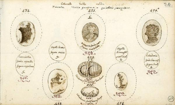 - NOTIZIE STORICO CRITICHE Il disegno con n. 476 raffigura molto probabilmente un cammeo. La comune collocazione fisica e la descrizione delle gemme copiate in questa pagina dimostrano l'interesse naturalistico di Sozzi, grande estimatore della bellezza delle pietre preziose in se stesse e dell'aspetto curioso e bizzarro con cui a volte si presentano in natura. Questo aspetto del gusto del collezionista si ricollega alla tradizione seicentesca del collezionismo di "naturalia" e "artficialia" apprezzati allo stesso modo e collocati nelle Wunderkammern.