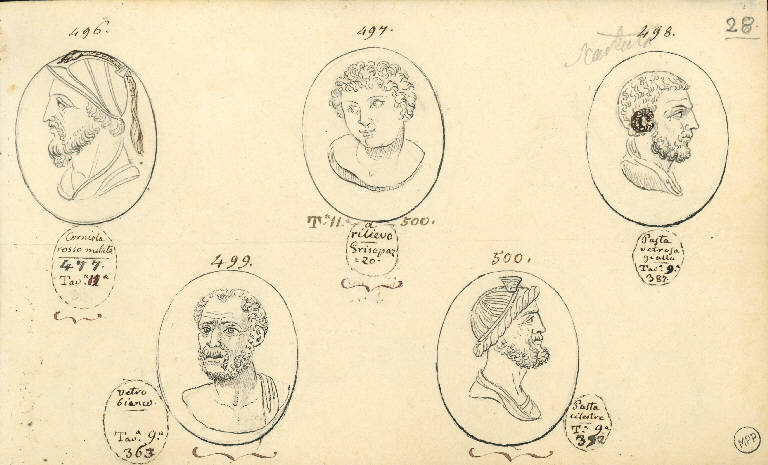 - NOTIZIE STORICO CRITICHE I disegni con nn.497 e 500 potrebbero riferirsi a gemme antiche; il disegno con n. 497 riproduce un cammeo; quello con n. 498 presenta un'iconografia (testa maschile di profilo con corno al posto dell'orecchio) interpretabile come Zeus Ammone oppure come Alessandro Ammone.