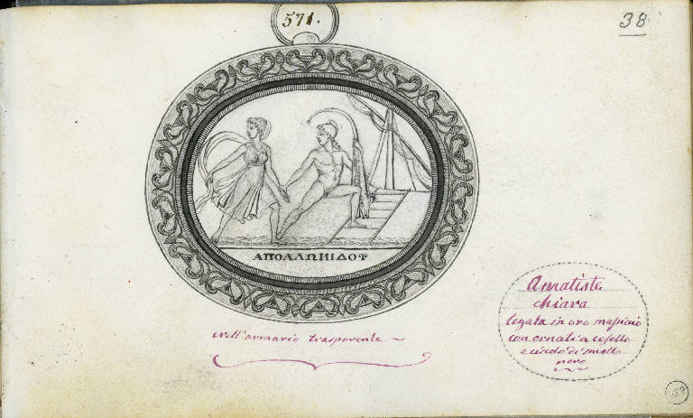 - NOTIZIE STORICO CRITICHE Il disegno riproduce un gemma che per iconografia, firma e soprattutto per lo stile rimanda alla collezione glittica del principe Stanislao Poniatowski (1754- 1833), in particolare a quelle pietre, di qualità alta, incise da artisti da lui incaricati negli ultimi anni della sua vita per accrescere la sua collezione. Gli studiosi hanno contato circa 2600 gemme "moderne", nettamente distinte dalla sua collezione di gemme antiche. Dopo la morte del principe la collezione "moderna" fu venduta all'asta a Londra nel 1839 come collezione di gemme antiche, provocando uno scandalo (Seidmann 1999, p. 269). E' probabile che Sozzi fosse a conoscenza del fatto che questa gemma non fosse antica; la preziosa montatura in oro dei due pezzi (v. anche scheda seguente) della sua collezione, il pregio delle due pietre e forse le loro dimensioni dovettero indurlo a ritenerle particolarmente preziose e a scegliere una collocazione più importante e visibile rispetto a quella delle altre gemme. I soggetti delle gemme della collezione Poniatowski, definita stravagante anche negli anni a ridosso della vendita di questa, quando le gemme vennero per la prima volta studiate (ibid., p. 267), erano di tipo mitologico o epico e riportavano con accuratezza molti particolari; la firma con il nome di un incisore greco - noto nell'antichità o sconosciuto - era frequentissima; lo stile di quelle che rappresentano più di una figura, come appare nei due disegni dell'album Sozzi, è caratterizzato dalla volontà di rendere in modo dinamico e un po' lezioso i personaggi. Studi recenti (Tassinari 1996, Seidmann 1999) hanno accertato che diversi intagliatori lavorarono per Poniatowski, il quale avrebbe scelto i soggetti letterari e proposto dei disegni o cartoni di artisti neoclassici; tra gli intagliatori sono stati identificati Luigi Pichler (1773-1854), che eseguì alcune impronte delle gemme Poniatowski, oggi conservate al Castello di Varsavia, e Giovanni Calandrelli (1784-1852), intagliatore di pietre dure romano che disegnò e intagliò molte gemme (calchi di parte delle quali sono conservati presso la raccolta Cades del Deutsches Archäologisches Institut di Roma) di questa collezione (Seidmann 1999, p. 268). L'iconografia della gemma disegnata da Sozzi non rientra tra quelle citate nell'elenco dei disegni di Calandrelli, firmati "Apollonidos" (non sappiamo se perchè Poniatowski chiedeva e voleva questa firma, o se l'autore la mettesse di sua iniziativa), conservati all' Antikenmuseum di Berlino (Platz-Horster 2005, pp. 143-146).