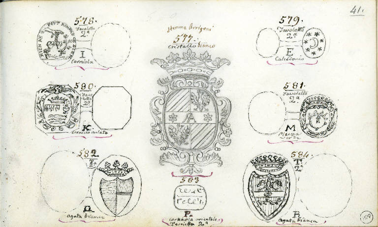 - NOTIZIE STORICO CRITICHE Il disegno con n. 578 raffigura una gemma che per i soggetti raffigurati - due cuori, una pianta e un fiore - e per il tipo e il significato dell' iscrizione rimanda al repertorio di Jacques Guay (1711-1793 c.), incisore di Luigi XV e allievo di Boucher, che fu il principale ispiratore delle sue gemme (vedi le pagg. 7, 9, 18, 21 e 22 dell'album). Il disegno con n. 577, al centro della pagina, è stato eseguito prima degli altri in questa pagina, e si può attribuite a una mano diversa, per la maggiore accuratezza e sicurezza di tratto e per la resa armoniosa dell'insieme. La famiglia Arrigoni, alla quale si riferisce, come dice l'iscrizione, lo stemma, era orinaria della Val Taleggio e risiedeva a Bergamo.