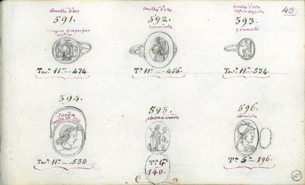- NOTIZIE STORICO CRITICHE I disegni di questa pagina raffigurano sei gemme che potrebbero essere di epoca antica. I disegni con nn. 591, 592, 593, 594 raffigurano ognuno la gemma inserita nella montatura metallica di un anello.