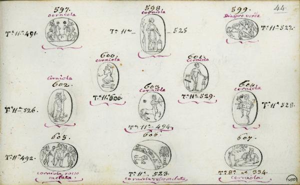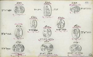 - NOTIZIE STORICO CRITICHE Il disegno con n. 597 raffigura una gemma la cui iconografia, con piccole varianti (la posizione delle aste e delle due stelle simbolo di divinità) si ritrova in uno stampo in vetro, derivato da un intaglio, della collezione Paoletti del Museo di Roma (Pirzio BiroliStefanelli 2007, n. 107, tomo IV, cass. 2); l'intaglio cui si riferisce l'impronta vitrea, realizzata nella prima metà dell'ottocento dall'incisore Pietro Paoletti (1785-1844/5) allo scopo di poter realizzare, con essa, dei calchi da vendere ai turisti e agli antiquari che giungevano a Roma, è databile dall'antichità al sec. XVI (ibid., p. 22). Il disegno con il n. 607 riproduce una gemma molto probabilmente ottocentesca. Alcune delle altre gemme raffigurate potrebbero essere antiche.