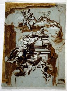 - NOTIZIE STORICO CRITICHE Riccardo Lampugnani ha acquistato il disegno nel 1967, durante l'asta Finarte del 30 ottobre di quell'anno, come documenta la ricevuta di pagamento applicata sul cartoncino di supporto (Asta Finarte, n° 36, 30 ottobre 1967, cat. n° 90, attribuito a Gregorio De Ferrari, £. 180.000). Due foto dell'opera sono conservate negli album Lampugnani D. 2 (negativo n° 23438 Perotti) e D. 13. Il disegno è uno studio prepratorio eseguito da Gregorio De Ferrari per il monumento funebre del patriarca di Venezia Francesco Morosini, poi scolpito da Filippo Parodi tra il 1678 e il 1683 nella chiesa di San Nicola da Tolentino a Venezia. Mary Newcome Schleier, nel 1989, pubblica uno studio preparatorio di Gregorio De Ferrari per lo stesso monumento, conservato nel Gabinetto deille Stampe e dei disegni degli Uffizi e assai simile a questo, ma meno rifinito (M. Newcome Schleier "Disegni genovesi dal XVI al XVIII secolo", Firenze 1989, cat. n°80, pp. 158-160). Nel 1998, la Schleier riprende l'argomento e accosta al disegno degli Uffizi un foglio di Gregorio De Ferrari passato in asta presso Finarte nel 1967: lo stesso, senza dubbio, che in quella occasione aveva acquistato Riccardo Lampugnani (M. Newcome Schleier "Gregorio De Ferrari", Torino 1998).