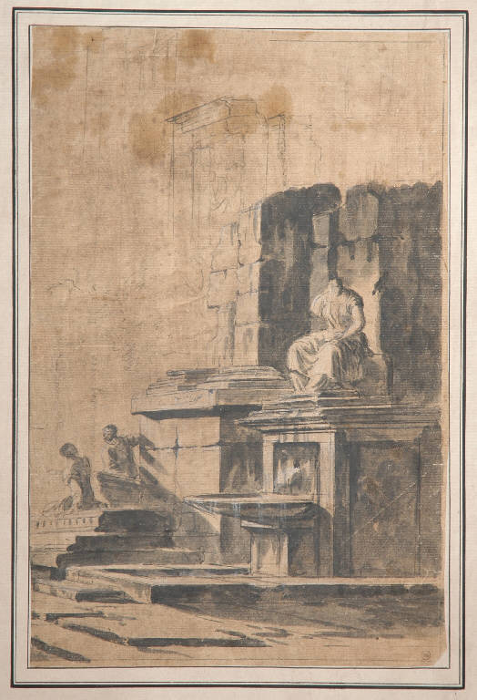 - NOTIZIE STORICO CRITICHE Una nota a pastello bianco sul cartoncino di supporto attribuisce il disegno a "Ghisolfi", riprendendo la scritta antica presente al verso del foglio, sul controfondo. Il disegno è, in effetti, studio preparatorio per la parte destra di un bel quadro di Giovanni Ghisolfi (Milano 1623-1683), la "Scena architettonica portuale con un apostolo che distribuisce l'elemosina" (olio su tela, cm 85 x 100, collezione Carlo Carmine, Sesto San Giovanni; cfr. A. Busiri Vici "Giovanni Ghisolfi 1623-1683)", Roma 1992, cat. n° 26, p. 72).
