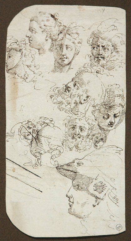 - NOTIZIE STORICO CRITICHE Alcune note a matita poste sul supporto, riferiscono questa serie di eleganti studi di teste a Pietro Antonio Novelli e a Francesco Fontebasso. A mio avviso, invece, il foglio è da assegnare ad un artista bolognese, attivo nella seconda metà del XVIII secolo, per il segno a penna libero e sciolto, ma attento a definire con precisione i contorni, e per l'uso sapiente del tratteggio, che modella i volumi con brevi linee parallele rapidamente tracciate, al modo di Gaetano e Ubaldo Gandolfi. L'anonimo autore del foglio Lampugnani potrebbe forse essere uno scultore, o un decoratore, per l'attenta definizione plastica delle piccole teste.