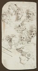 Dieci studi di teste maschili e femminili, a penna e inchiostro nero su carta bianca.