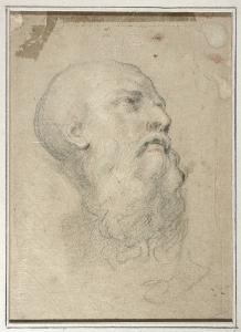 Studio di testa di vecchio con barba. Matita nera, rossa e gessetto bianco su carta grezza. Filigrana intera, a forma di giglio rovesciato.