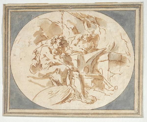 In ovale, riquadrato a penna. A penna, inchiostro bruno, acquerello bruno, acquerello grigio su cartoncino bianco.