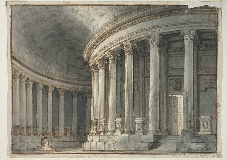 - NOTIZIE STORICO CRITICHE Riccardo Lampugnani ha acquistato il disegno durante l'asta Finarte del 27 e 28 novembre 1974: sul cartoncino di supporto, infatti, è applicata la copia del verbale di aggiudicazione (asta Finarte n°194, 27 e 28 novembre 1974, cat. n° 250, Pio Panfili "Interno di edificio rotondo", £. 170.000). In quella occasione, il foglio era assegnato a Pio Panfili (Fermo 1723 - Bologna 1812): a lato del verbale, Riccardo Lampugnani ha annotato a matita una ipotesi di attribuzione a Mauro Tesi. In realtà, il disegno appartiene con ogni probabilità a Francesco Fontanesi (Reggio Emilia 1751-1795): è infatti d'identico tema e di stile assai vicino all' "Interno del tempio di Apollo" che Fontanesi eseguì nel 1792 per il secondo sipario, oggi perduto, del Teatro "La Fenice" di Venezia; il sipario fu poi dipinto da Pietro Gonzaga che, a sua volta, aveva eleborato alcuini schizzi, con varianti, dello stesso soggetto (cfr. M. Pigozzi "Da Francesco Fontanesi ad Alfonso Trombetti. La scuola bolognese di scenografia fra Settecento e Ottocento", in "Saggi e Memorie di storia dell'arte", n° 27, Venezia 2003, pp. 479-480, figg. 5-6; M.T. Muraro "Scenografie di Pietro Gonzaga", Venezia 1967, pp. 68-69, cat. n° 96).