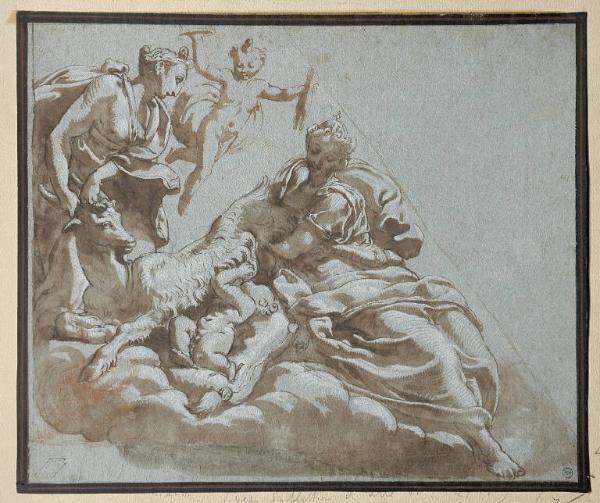 - NOTIZIE STORICO CRITICHE Il foglio reca una attribuzione a Giulio Romano, ripetuta varie volte anche sul cartoncino di supporto, e accompagnata da un riferimento al "Camerino dei Cesari" nel castello di Mantova. Una foto del disegno è conservata nell'album Lampugnani D. 1 (negativo 23298 Perotti). Alcuni appunti a proposito del foglio si trovano nell'album D. 2: in particolare, Riccardo Lampugnani segnala una incisione dello stesso tema eseguita da G.B. Scultori e tratta da soggetto di Giulio Romano. In realtà, l'incisione a cui allude Lampugnani è di Giulio Bonasone (1550 ca.) e riproduce in controparte il disegno preparatorio di Giulio Romano per il "Giove allattato dalla capra Amaltea", dipinto da Giulio Romano tra il 1533 e il 1534 per Federico Gonzaga e ora conservato ad Hampton Court (cfr. cat. n° 60, p. 71 in "Giulio Romano pinxit et delineavit. Opere grafiche autografe, di collaborazione e di bottega", a cura di Stefania Massari, Roma 1993). Dell'invenzione di Giulio Romano, però, il disegno Lampugnani conserva assai poco: appena il gesto della ninfa che trattiene per le zampe posterori la capra Amaltea, e la posizione di Giove bambino, steso sotto il ventre dell'animale. A mio avviso, per la tipologia dei volti femminili, appuntiti e aggraziati, per il tipo di panneggio a pieghe sottili e ritorte, per le preziose rifiniture a sottili filamenti di biacca, il foglio di collezione Lampugnani è da assegnare, piuttosto, ad un artista vicino a Francesco Primaticcio (Bologna 1504-Fontainebleau 1570; si veda, per confronto, la "Figura femminile" del Louvre, cat. 201, pp.375-376 in "Primatice, maitre de Fontainebleau", a cura di Dominique Cordellier, Parigi 2004; o la figura di donna seduta a destra nel "Concerto" dell'Albertina di Vienna, cat. 223, p. 396, in "Primatice..." cit.)