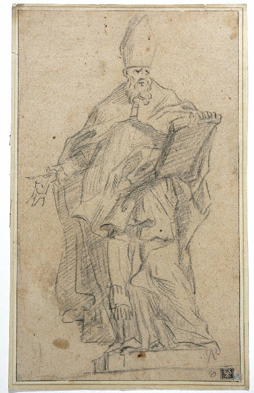 - NOTIZIE STORICO CRITICHE Il disegno reca, in basso a destra, una marca di collezione non compresa in Lugt e per ora non identificata. Al verso del foglio, una scritta a matita riferisce questa figura di Sant'Agostino a Gian Lorenzo Bernini: ma la qualità del foglio non consente, a mio avviso, di confermare l'attribuzione. Il disegno di collezione Lampugnani è, con ogni probabilità, uno studio eseguito nella bottega di Bernini per il Sant'Agostino che orna, a destra, la cattedra di S. Pietro: le varianti, rispetto alla statua finita, sensibili soprattutto nel movimento del mantello e nella posizione del braccio sinistro, piegato a reggere il libro, escludono infatti la possibilità di una copia. Lo studio è stato forse eseguito attorno al 1657, anno in cui il bozzetto presentato da Bernini fu definitivamente approvato dai committenti (cfr. A. Bacchi - S. Tumidei "Bernini. La scultura in S. Pietro", Milano 1998).