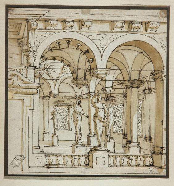 Progetto architettonico per loggia. A penna, inchiostro nero e acquerello grigio/ bruno.