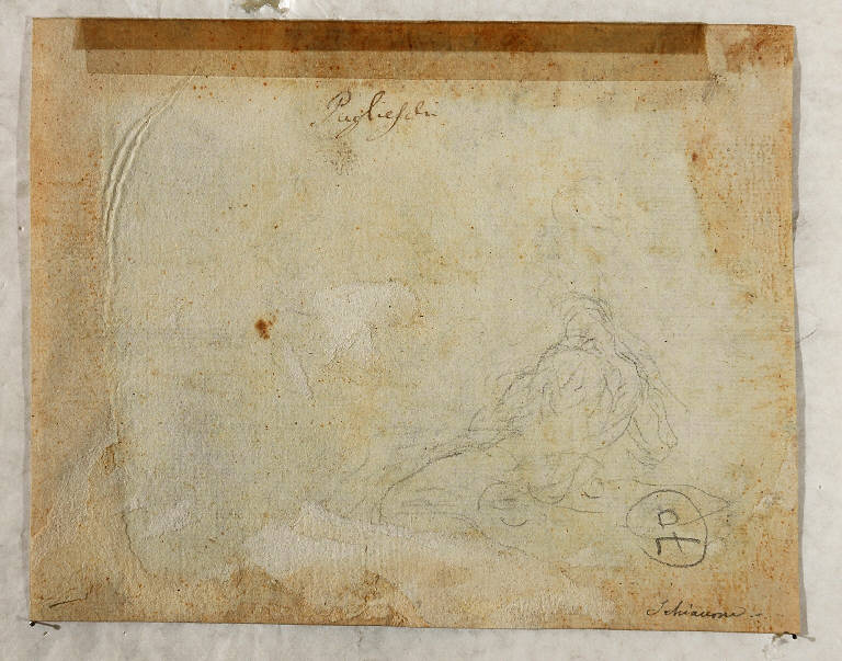 - NOTIZIE STORICO CRITICHE Al verso, una scritta antica a penna, posta in alto al centro, riferisce il disegno a Puglieschi; una seconda nota, a matita e più recente propone il nome di Schiavone. Sul cartoncino di supporto, un ultimo appunto attribuisce questo paesaggio con figure di pastori alla cerchia del Magnasco. A mio avviso, il foglio di collezione Lampugnani, per il tratto rapido che definisce le forme con striature parallele del pennello, può essere accostato, meglio, ad un disegno di fattura assai simile, recentemente attribuito a Giovanni Battista Beinaschi (Fossano, Cuneo 1636-Napoli 1688; cfr. "Giona sputato dalla balena", cat. XL, p. 78 in "I disegni italiani dell'Accademia di Romania a Bucarest", a cura di M. Chiarini, Firenze 2004). Il nudo virile del verso, a matita, appartiene probabilmente alla stessa mano.
