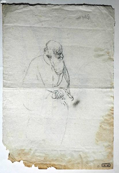 - NOTIZIE STORICO CRITICHE Si tratta, ad evidenza, di due studi per la stessa figura di uomo anziano, rivestito da un manto, colto con pochi segni sicuri e asciutti di matita in due posizioni diverse: lo stesso tratto essenziale si ritova in acuni disegni della piena maturità di Domenico Morelli, e particolarmente negli studi preparatori per il "Torquato Tasso" del 1863-65 (cfr. i nn° 19-20, pp. 116-117 in "Domenico Morelli: il pensiero disegnato. Opere su carta dal fondo dell'artista presso la GAM di Torino", a cura di C. Poppi, Torino 2001).