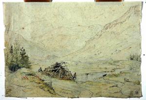 - NOTIZIE STORICO CRITICHE Il disegno reca, in basso a destra, una scritta a matita, forse una firma: "C. Canella". Con ogni probabilità, l'autore del disegno è Carlo Canella (Verona 1800-Milano 1879), fratello del più noto Giuseppe, pittore di paesaggi e vedute. Carlo è spesso presente alle esposizioni annuali della Accademia di Brera, negli anni tra il 1835 e il 1877, con dipinti di genere diverso: vedute, e soprattutto scene d'interno. Questo paesaggio di montagna, e l'altro, posto al verso, sembrano appunti presi rapidamente dal vero, a matita, con note veloci per memoria dei colori.