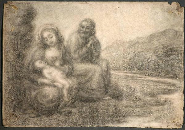 - NOTIZIE STORICO CRITICHE Sul cartoncino di supporto,Riccardo Lampugnani ha annotato il nome di Piccio; sotto il foglio è applicata una striscia di carta con una scritta a matita, di mano del Caversazzi, secondo il collezionista milanese, che conferma l'attribuzione al Piccio. Il disegno è forse un primo studio per il "Riposo nella fuga in Egitto" di collezione privata bergamasca, a olio su tela, firmato e datato 1862 (cfr. tav. 26 in "Giovanni Carnovali detto il Piccio 1804-1873 nelle collezioni private bergamasche", Bergamo 1970).