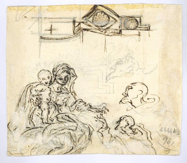 Studio per Madonna con Bambino e San Francesco a matita, penna e inchiostro bruno su carta bianca. La testa del santo è studiata in due diversi schizzi, a penna e a matita