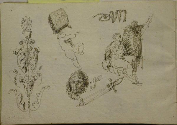 Da sinistra: studio di elemento decorativo; libro; putto; figura femminile seduta e figura maschile in piedi, il braccio sinistro levato; spada; volto maschile.