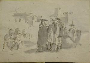 - NOTIZIE STORICO CRITICHE Non sappiamo quando questo interessante taccuino d'appunti, composto di studi di figure e d'architettura, di paesaggio e di decorazione, e di schizzi di episodi della vita di Napoleone, sia entrato a far parte della collezione di Riccardo Lampugnani; e nessuna attribuzione è mai stata proposta per cercare di individuarne l'autore. La sola informazione, una scritta a matita, compare sulla terza di copertina: "Copie da Orazio Vernet, Storia di Napoleone, su l'Ardèche". Indicazione preziosa, perchè consente almeno di precisare la data di una parte del taccuino: i disegni di tema napoleonico che l'anonimo artista ha tracciato, con mano veloce e sintetica, sull'intera seconda parte del volumetto, a partire dalla carta 7 verso, sono tratti dalle vignette che Horace Vernet aveva disegnato per la "Histoire de l'empereur Napoléon" scritta da Paul Mathieu Laurent de l'Ardèche e pubblicata a Parigi nel 1839; nello stesso anno, la tipografia torinese Fontana pubblicò la prima edizione italiana del testo, per le cure di Antonio Lissoni, che era stato ufficiale di Napoleone ("Storia di Napoleone di P.M. Laurent de l'Ardèche illustrata da Orazio Vernet voltata in italiano da Antonio Lissoni e da esso cresciuta delle imprese militari delle soldatesche italiane", Torino, Fontana, 1839). Questa edizione, senza dubbio, aveva sotto gli occhi l'anonimo autore del taccuino Lampugnani: ne copia, infatti, talvolta, brevi brani, o frasi; e annota rapidamente, con un segno a penna libero e sicuro, appena rilevato dall'acquerello grigio, i disegni di Horace Vernet che più attirano la sua attenzione. Spesso, di quelle vignette, appunta solo dei particolari: come per memoria, durante la lettura. E' possibile che quei disegni l'artista li abbia eseguiti in anni assai vicini alla data della pubblicazione del volume; e quindi attorno al 1839, o poco oltre, per l'inflessione ancora nettamente neoclassica che rivelano i primi fogli del volumetto, ricchi di piccoli studi di figure, di paesaggio, di motivi d'ornato: oltre la metà del secolo, infatti, quell'aria settecentesca sarebbe del tutto fuori tempo. Chi sia però l'autore di questi disegni, non è facile dire: anche se, a mio parere, il tratto a penna netto e pulito, l'acquerellatura veloce delle vignette di tema napoleonico sono assai vicini a quelli che usa Massimo D'Azeglio (Torino 1798 - 1866) in certi suoi libretti d'appunti degli anni '20 e '30 del XIX secolo (cfr. ad esempio le tavole n°66-67, pp. 116-117, in "Massimo D'Azeglio. Mostra organizzata dalla città di Torino nel primo centenario della morte", Torino, 1966). \nL'anonimo autore del taccuino riprende quasi per intero, con l'eccezione di qualche dettaglio, la vignetta che illustra un episodio della guerra di Spagna, l'ingresso delle truppe francesi a Madrid, sotto la guida di Gioacchino Murat, il 23 marzo 1808 (Laurent de l'Ardèche, Torino 1839, p. 484).