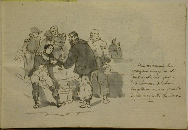 - NOTIZIE STORICO CRITICHE Non sappiamo quando questo interessante taccuino d'appunti, composto di studi di figure e d'architettura, di paesaggio e di decorazione, e di schizzi di episodi della vita di Napoleone, sia entrato a far parte della collezione di Riccardo Lampugnani; e nessuna attribuzione è mai stata proposta per cercare di individuarne l'autore. La sola informazione, una scritta a matita, compare sulla terza di copertina: "Copie da Orazio Vernet, Storia di Napoleone, su l'Ardèche". Indicazione preziosa, perchè consente almeno di precisare la data di una parte del taccuino: i disegni di tema napoleonico che l'anonimo artista ha tracciato, con mano veloce e sintetica, sull'intera seconda parte del volumetto, a partire dalla carta 7 verso, sono tratti dalle vignette che Horace Vernet aveva disegnato per la "Histoire de l'empereur Napoléon" scritta da Paul Mathieu Laurent de l'Ardèche e pubblicata a Parigi nel 1839; nello stesso anno, la tipografia torinese Fontana pubblicò la prima edizione italiana del testo, per le cure di Antonio Lissoni, che era stato ufficiale di Napoleone ("Storia di Napoleone di P.M. Laurent de l'Ardèche illustrata da Orazio Vernet voltata in italiano da Antonio Lissoni e da esso cresciuta delle imprese militari delle soldatesche italiane", Torino, Fontana, 1839). Questa edizione, senza dubbio, aveva sotto gli occhi l'anonimo autore del taccuino Lampugnani: ne copia, infatti, talvolta, brevi brani, o frasi; e annota rapidamente, con un segno a penna libero e sicuro, appena rilevato dall'acquerello grigio, i disegni di Horace Vernet che più attirano la sua attenzione. Spesso, di quelle vignette, appunta solo dei particolari: come per memoria, durante la lettura. E' possibile che quei disegni l'artista li abbia eseguiti in anni assai vicini alla data della pubblicazione del volume; e quindi attorno al 1839, o poco oltre, per l'inflessione ancora nettamente neoclassica che rivelano i primi fogli del volumetto, ricchi di piccoli studi di figure, di paesaggio, di motivi d'ornato: oltre la metà del secolo, infatti, quell'aria settecentesca sarebbe del tutto fuori tempo. Chi sia però l'autore di questi disegni, non è facile dire: anche se, a mio parere, il tratto a penna netto e pulito, l'acquerellatura veloce delle vignette di tema napoleonico sono assai vicini a quelli che usa Massimo D'Azeglio (Torino 1798 - 1866) in certi suoi libretti d'appunti degli anni '20 e '30 del XIX secolo (cfr. ad esempio le tavole n°66-67, pp. 116-117, in "Massimo D'Azeglio. Mostra organizzata dalla città di Torino nel primo centenario della morte", Torino, 1966). \nL'anonimo autore del taccuino riprende in questo foglio la vignetta che Horace Vernet ha disegnato per illustrare un episodio avvenuto nel luglio 1804 (Laurent de l'Ardèche, Torino 1839, p. 314): Napoleone era in visita ai campi di addestramento del Nord, lungo la Manica; mentre si trovava a Boulogne, giunsero due marinai inglesi fuggiti da Verdun, dove erano prigionieri; erano riusciti a costruirsi una barca con il solo aiuto dei loro coltelli e con pezzi di legno sistemati alla meno peggio. I due marinai volevano raggiungere la fregata inglese che incrociava in vista della costa: ma furono catturati e condotti davanti all'imperatore. Napoleone, infatti, aveva chiesto di vederli: e, ammirato dal coraggio dei due, restituì loro la libertà. La scritta in basso a destra riassume la vicenda, sulla base del testo di Laurent de l'Ardèche.
