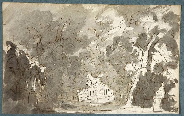 Scena raffigurante un viale alberato con tempio nello sfondo. PAESAGGIO