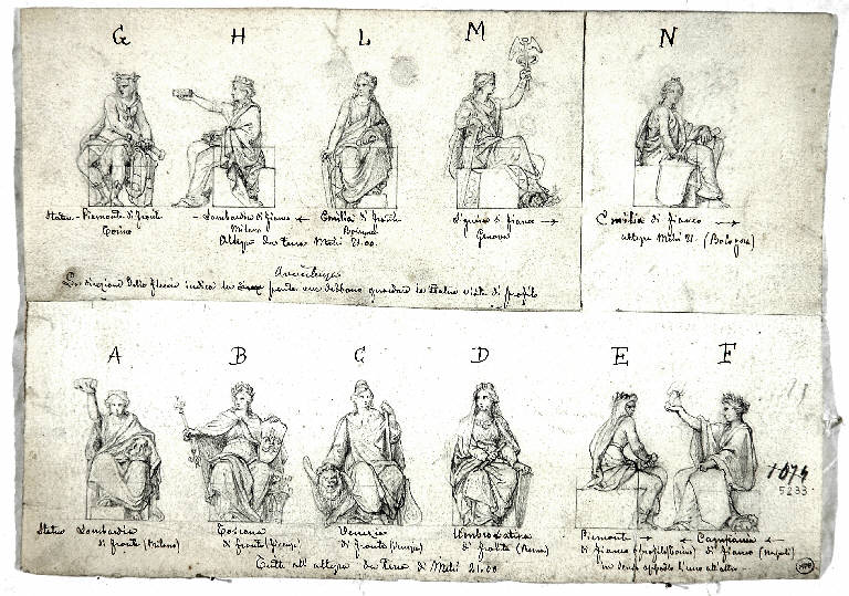 - NOTIZIE STORICO CRITICHE Per i soggetti raffigurati (statue con personificazioni delle aree regionali della penisola italiana) potrebbe trattarsi di bozzetti per una prima idea della decorazione della Sala del Nuovo Parlamento Subalpino di Torino in Palazzo Carignano (il cui soffitto veniva ornato da Francesco Gonin con le Arti e le Scienze), sostituita poi dalla raffigurazione a monocromo delle Scienze, oppure potrebbero essere in relazione con le figure allegoriche dell'atrio municipale di Torino (la Legge, la Diplomazia, la Guerra e l'Industria), citati entrambi dalle fonti. Stando alle scritte apposte vicino alle figure delle regioni, quasi tutte sedute, dovevano comparire accanto le personificazioni delle città più importanti, le quali, sempre facendo riferimento alle scritte autografe presenti sul foglio, dovevano essere disposte di fronte o di fianco (es. "Statua Piemonte, di fronte Torino", "Lombardia di fianco, Milano"). Le statue erano inoltre collocate secondo un preciso ordine, indicato da lettere (da A a N) o da numeri romani (I-V); veniva precisato che esse dovevano essere poste "Tutte all'altezza da terra di Metri 21.00" e veniva segnalata l'avvertenza che "la direzione delle frecce indica la parte che debbono guardare le statue di profilo". Il riferimento cronologico più adeguato dovrebbe essere circoscrivibile agli anni compresi tra il 1860-70, all'epoca in cui si realizzano i suddetti lavori di abbellimento dei menzionati palazzi. In particolare riguardo all'aula ad anfiteatro allestita nel 1848 per il Nuovo Parlamento di Palazzo Carignano, posta nell'antica sala circolare realizzata da Guarino Guarini (1679) su incarico del principe Emanuele Filiberto di Savoia Carignano, si segnala che la decorazione ad affresco fu eseguita da F. Gonin (1808-1889) insieme ad Angelo Capisani, Angelo Moja e Grazioso Rusca ed andò a sostituire la precedente progettata da Filippo Nicolis di Robilant (con la collaborazione di Leonardo Marini e dei fratelli Galliari per la volta). Essa accolse il 10 maggio 1848 i 204 rappresentanti del Regno Sardo e quindi i 387 membri del parlamento del Regno d'Italia. Riguardo ai disegni in esame sembra da escludere che essi possano essere messi in relazione con le otto figure stanti realizzate da Rodolfo Morgari (1827-1909), fratello di Paolo Emilio il Vecchio e nominato dal re nel 1858 "pittore e reaturatore dei Regi Palazzi", pur con analogie nell'impostazione del soggetto, per la facciata di Palazzo Ferrero d'Ormea, già Guarene, edificato su disegno dell'architetto Amedeo di Castellamonte (1613-1683), che andarono a sostituire quelle settecentesche create da Sebastiano Galeotti dopo i lavori ottocenteschi di ristrutturazione operati da Giuseppe Maria Talucchi.